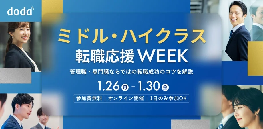 「dodaミドル・ハイクラス転職応援WEEK」は、ミドル・ハイクラス層の転職における不安や疑問を解消することを目的としたオンラインイベントです。