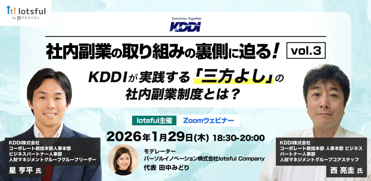 2026年1月29日(木)には、このKDDIの具体的な取り組みや、社内副業制度を活性化させるための実践的なノウハウを深掘りする無料オンラインセミナーが開催されます。自社の制度導入や改善を検討されている管理職・専門職の皆様にとって、貴重な学びの機会となるはずです。