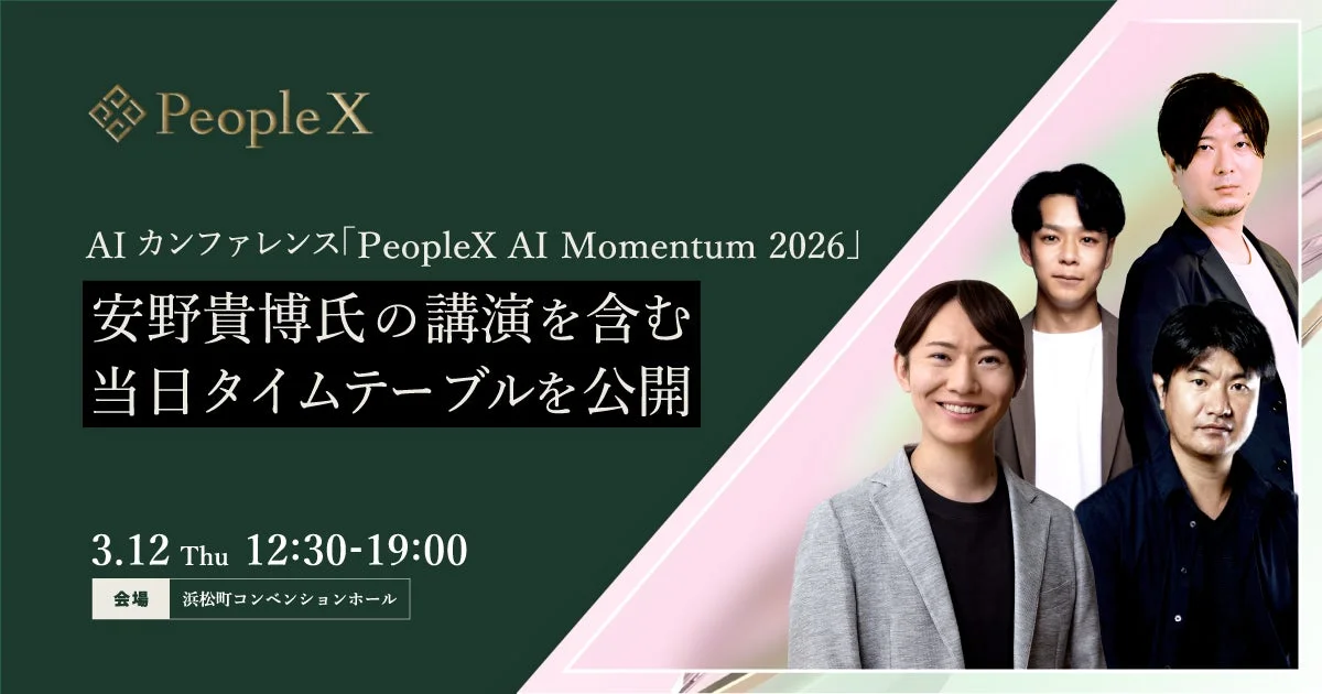 2026年3月12日(木)に浜松町コンベンションホールにて開催されるAIカンファレンス「PeopleX AI Momentum 2026」の講演内容と当日タイムテーブルが公開されました。本カンファレンスは、AIが企業経営や実務にどのような変化をもたらし、組織と事業をどのように強化するのか、実践的な視点から深く掘り下げる貴重な機会となるでしょう。