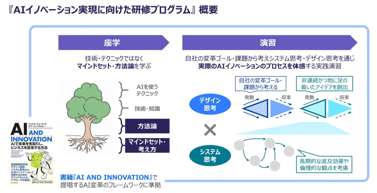 演習の例: 自社の変革ゴールや課題を起点に、システム思考やデザイン思考を駆使しながら、実際のAIイノベーションプロセスを体感する実践的な内容です。