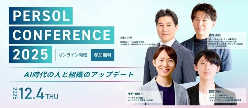 パーソルホールディングス株式会社は、AIが急速に進化する現代において、企業が持続的な競争力を維持するための「人と組織のアップデート」に焦点を当てた無料オンラインセミナー『PERSOL CONFERENCE 2025』を2025年12月4日(木)に開催いたします。本セミナーは、管理職や専門職の皆様が直面する課題に対し、実践的な解決策と具体的なアプローチを学ぶ貴重な機会となるでしょう。
