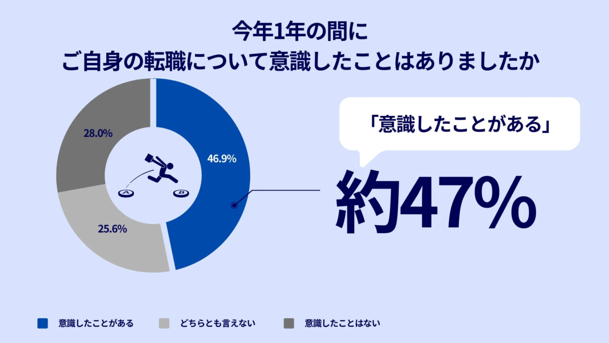 調査対象となった10代から60代の996名のうち、約47%が今年1年の間に自身の転職を意識したと回答しています。この結果は、多くのビジネスパーソンが現在の職務に留まるだけでなく、常に「次のキャリア」を模索している現状を浮き彫りにしています。